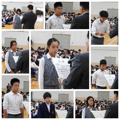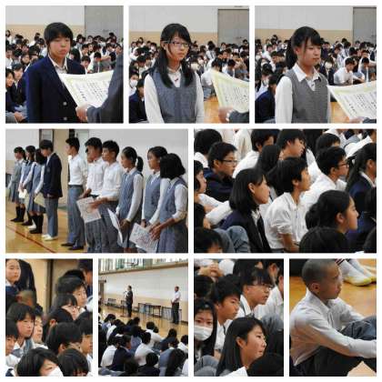全校集会 公開日 2016/10/14 更新日 2016/10/14 学校の様子 第3回テスト終了後、全校集会を行いました。 生徒会からの話、伝達表彰(陸上部、水泳部、緑化運動、愛鳥週間ポスター)が行われました。
