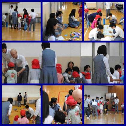 3年生 幼児と触れ合う活動 公開日 2016/10/19 更新日 2016/10/19 3年生 本日2時間目、3時間目の時間帯に竹田幼稚園の園児が来校し、3年生家庭科の授業で交流を行いました。 中学生たちも童心に戻り、交流を楽しんでいました。