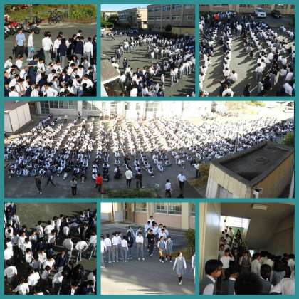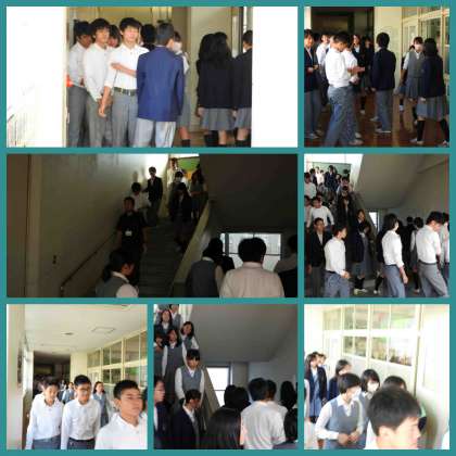 訓練。火災発生!中庭へ避難します。