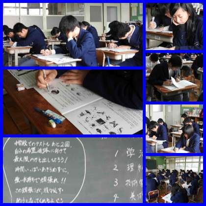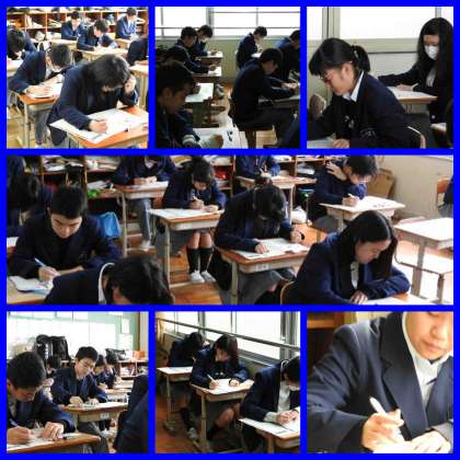 第4回テスト2日目(3年生1) 公開日 2016/11/24 更新日 2016/11/24 3年生 祝日を挟み、テスト2日目を迎えました。 3年生に取っては進路にも関わる大切なテスト。目力がすごいです。