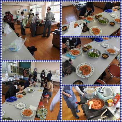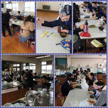 完成です。 トマトソースベースのピラフと具たくさんの豚汁を作りました。 みんなでおいしくいただきました。