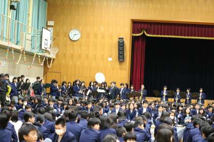 終わりの言葉の後、吹奏楽部演奏の「恋」にのって新入生退場。
