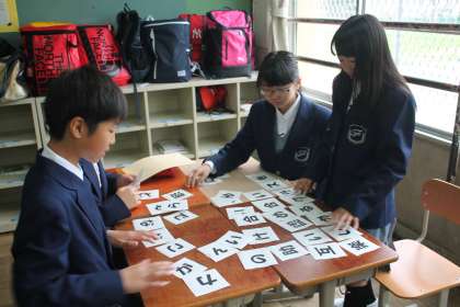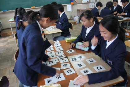 担任が「こんなくらすになってほしい」という思いを一文字ずつ紙にして班で正しい順番に並べるというゲームです。