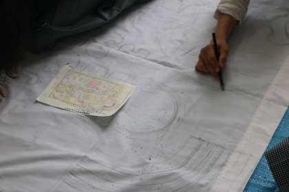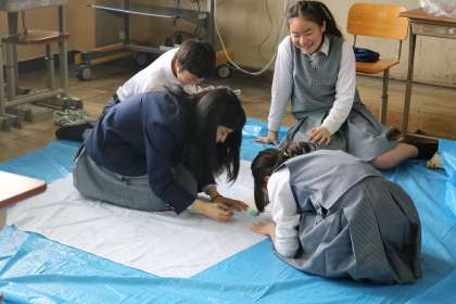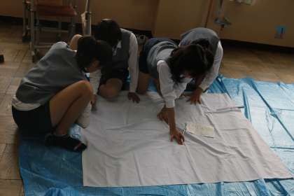 学級旗制作・・・2年生 公開日 2017/04/25 更新日 2017/04/25 2年生 学級旗の制作が1,2年生で行われています。 今日は、2年生は下書き。 クラスで決まったデザイン画を、旗の布地に鉛筆で書き込んでいきます。 画用紙に書くようにうまくいきません・・・ 布をピンと張って少しずつ少しずつ・・・ イメージ通りに仕上がるといいですね♪