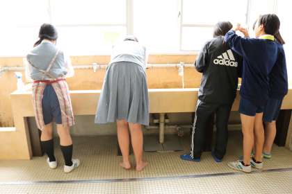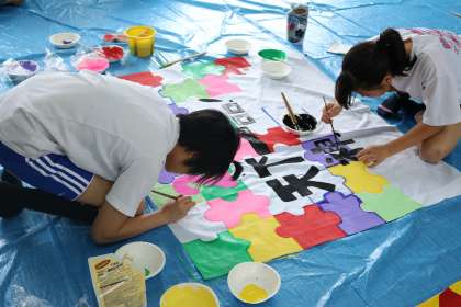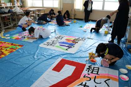 学級旗制作・・・2年生 公開日 2017/04/27 更新日 2017/04/27 2年生 先日は、下絵を描いていた2年生・・・ 今は、黙々といろ塗りをしています。 だんだん形になり、カラフルになってきました。 筆などを洗う人も、エプロン付けたり、裸足だったり。 一生懸命さが伝わってきます。