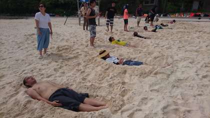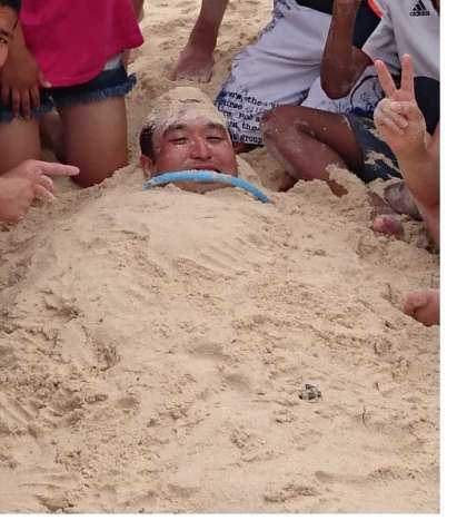 ルールは、各クラス担任が穴に寝転び、クラスの生徒が離れたところから小さなバケツに一杯ずつ砂をリレーしながら走って運び、顔以外きちんと埋まったクラスが勝ち♪