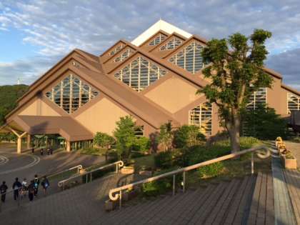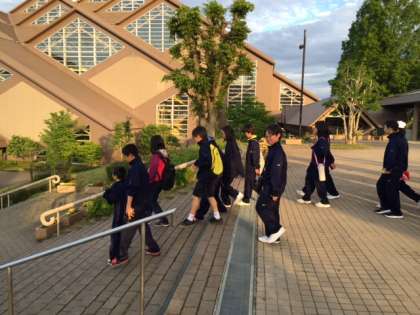 但馬ドームへ移動。 これからスポーツ大会です。 実行委員がハイタッチで盛り上げています。