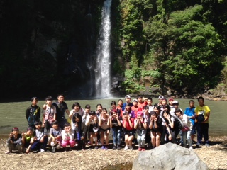 子どもたちはうどん作りに没頭中ですが、1組のクラス写真です。 滝の前で、「ハイチーズ!」