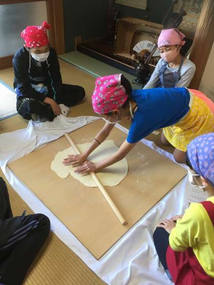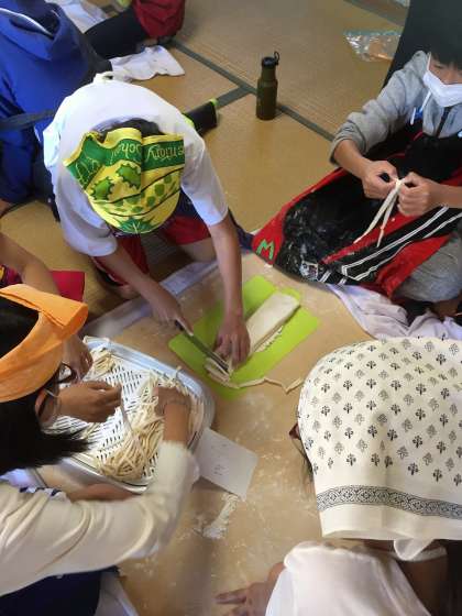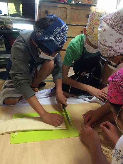 こちらも、伸ばして切って… 協力して作業をすすめています。