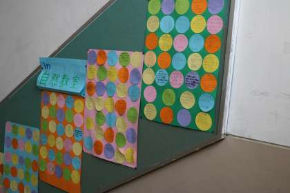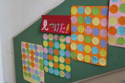 1年生の校舎の階段には、『いいところ みつけた IN 自然教室』が掲示してあります。