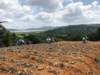 農業体験の様子です。パイナップルの苗植えを手伝っています。