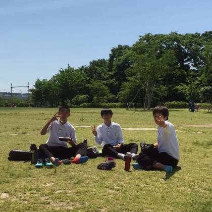 晴天の下、2年生は京都市内校外学習に行っています。梅小路公園での様子です。気持ちよく過ごしています。
