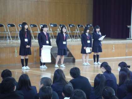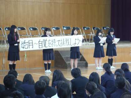 最後に生徒会から4月のスローガンの発表がありました。4月を「始月」と読み、「〜自覚を持って挑戦しよう〜」との説明がありました。全校がスローガン実現に向けて、頑張りましょう。