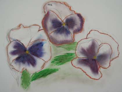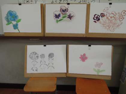 1組美術授業作品を紹介します。今日の美術は1年生は校外学習、3年生は修学旅行ということで、2年生のみで行いました。題材名は,『「見方を変えて」〜いつも見ているパンジーをよく見よう〜』です。どの作品も細かなところまで描いてあり、すばらしい作品ができていました。