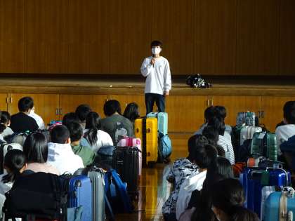 荷物の確認と諸注意,添乗員さんと写真屋さんの紹介,生徒実行委員長の挨拶,校長先生のお話がありました。