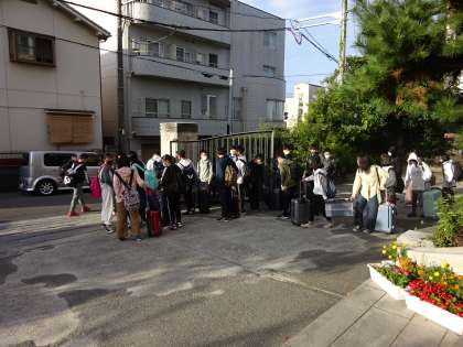 結団式を終えた修学旅行団は,たくさんの教職員に見送られ,バスに乗車して出発しました。