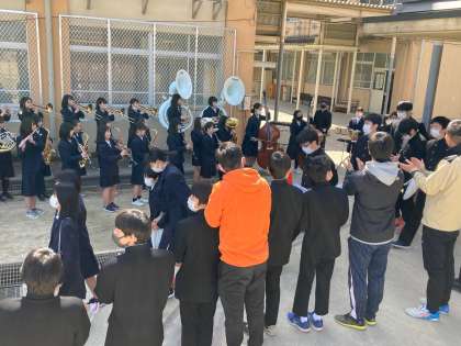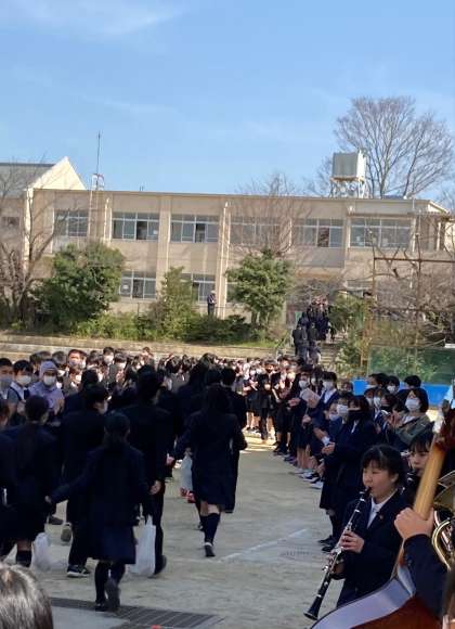 青空の下,吹奏楽部の演奏をバックに懐かしい高台グラウンドへと続く花道を歩く3年生。