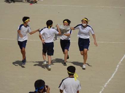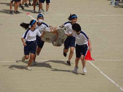 新聞紙で作った大きなシートの上にボールを乗せてゴールまで運ぶ『フライングシート』。