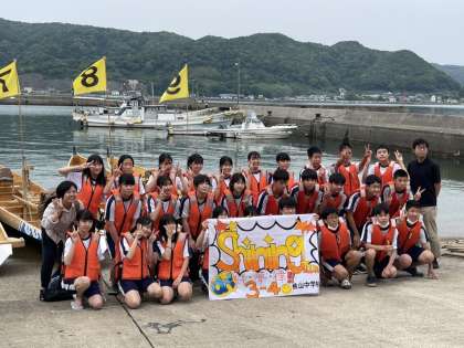 ライフジャケット姿で学級旗を持ってのクラス写真撮影。
