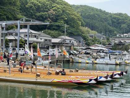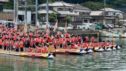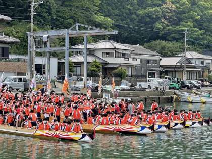 レクチャーを受け,各クラスの学級旗を掲げたペーロン船が出航!