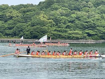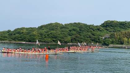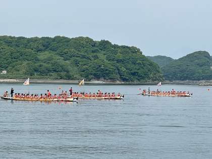 太陽に照らされながら,太鼓に合わせて精一杯漕ぎます。