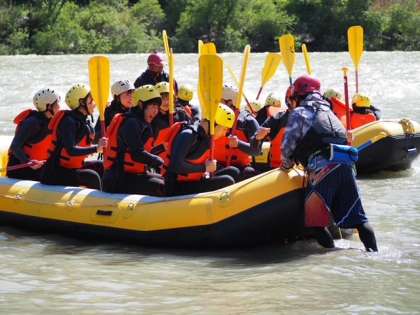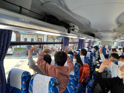 インストラクターさんのお見送りを受けてラフティング会場「川の駅さざなみ」を後にし、白馬村に向かっています!
