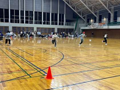 答えがわかったら新聞紙が落ちないようにダッシュしてボタンを押せたら回答できるルールです!