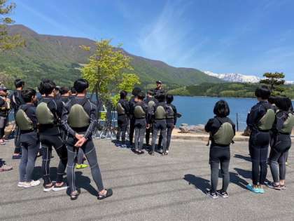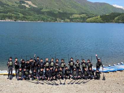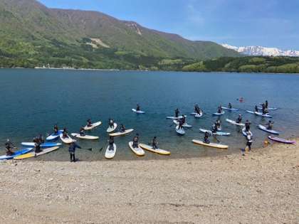 SUP (Stand Up Paddle Surfin')の説明を聞いて湖に漕ぎ出しました。