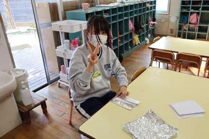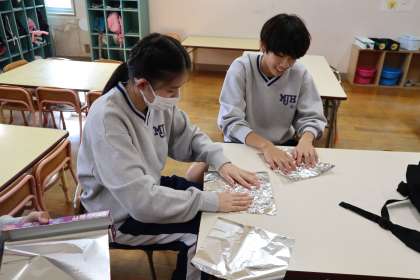 世光保育園 アルミホイルを使って12月の掲示物作成の準備をしました。