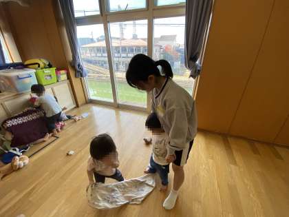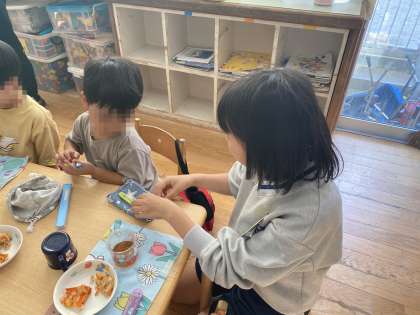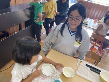 うづらこども園 園児たちと一緒にお昼ご飯を食べたり遊んだりしています
