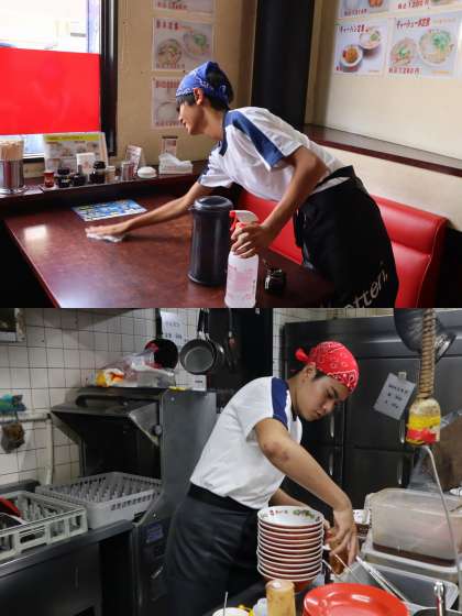 皿洗いや配膳・下膳、テーブルの清拭を行っています。