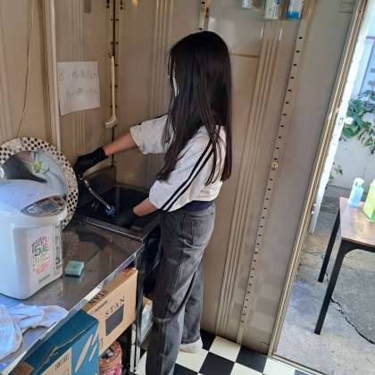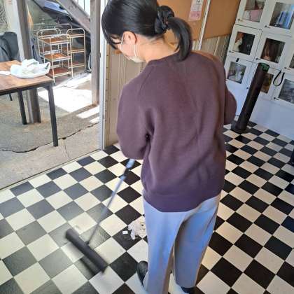 お店の裏でお掃除を頑張っていました。