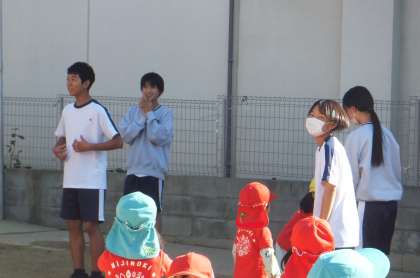運動場で鬼ごっこをしたり、お砂遊びをしたり、ぐるぐる体操を一緒にしていました。