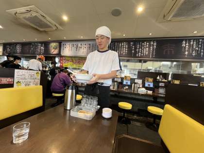 配膳やお皿洗いなどに取り組んでいます。「声が小さい!」とお店の方からも檄が飛んでいましたが、仕事の厳しさを学びながら一生懸命取り組んでいました。