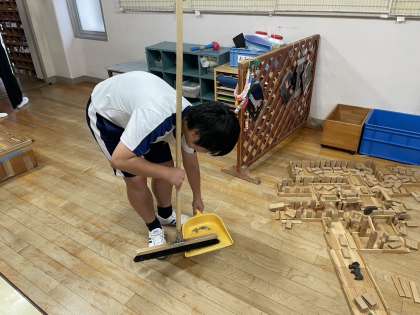 それぞれの園児さんに寄り添って、一緒に遊んだり、お手伝いをしました。また、お掃除も丁寧に行っていました。掃除や次の活動の準備も保育士の大切なお仕事です。