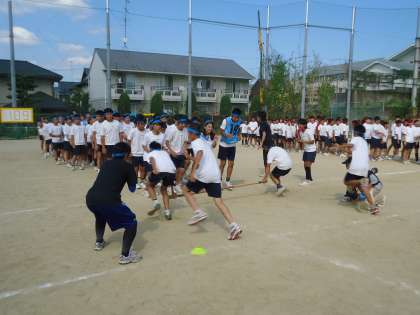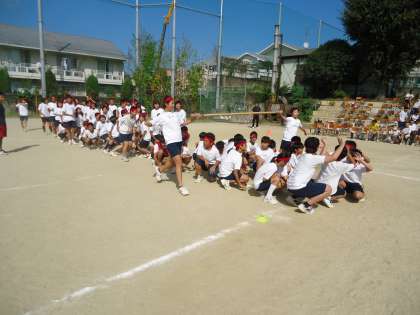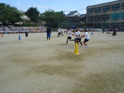 1年生の学年種目は、「台風の目」。4人一組となって協力しながら、竹をリレーしました。思ったよりもコーンをまわるのに手間取ったり「早く、早く」と声をかけあっていました。