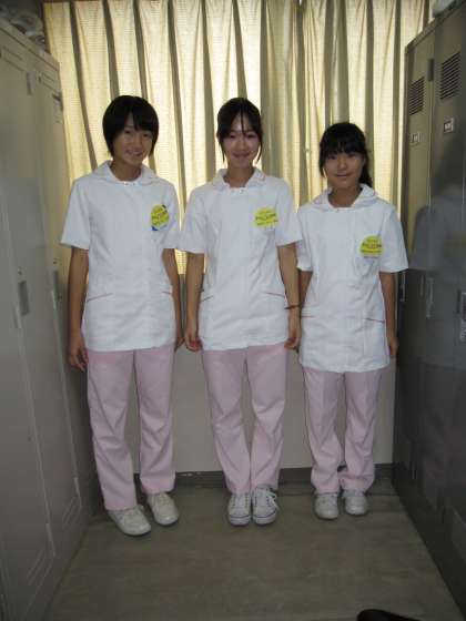 事業所では事務作業、品だし前の準備といった裏方の仕事も体験させていただいています。医療関係の施設ではユニフォームをお借りし、ナース気分でがんばっていました。