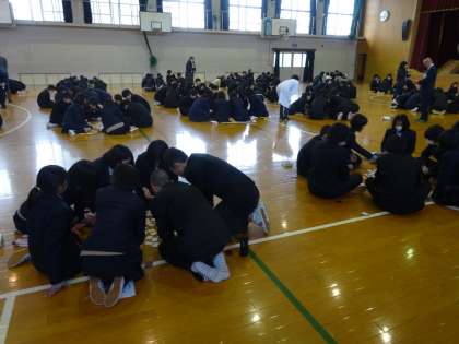 今日の午後、2年生は百人一首大会を体育館で行いました。大型ストーブと生徒たちの熱気で何とか寒さを凌ぎ、静けさの中にも真剣な戦いが繰り広げられました。中には、ジャンケンで取り手を決めるほどの接戦も。