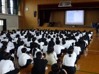 5限目、1年生は体育館にて、京都府警から市教委生徒指導課に派遣されている石塚先生を講師としてお迎えし、「非行防止教室」を行いました。