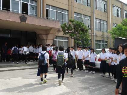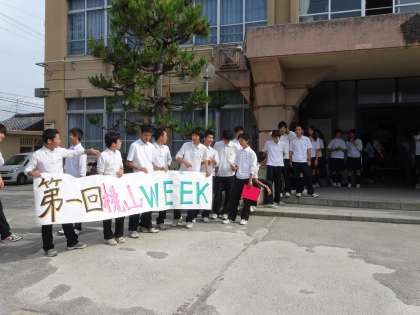 生徒会本部、議会、生活委員会の生徒たちは、あいさつとルールの呼びかけに取り組んでいます。