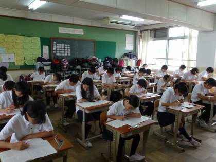 2年生は学習確認プログラムに取り組んでいます。朝から汗の噴き出る蒸し暑さですが、教室内はクーラーで別世界です。テスト5連発は大変ですが、空調が教室にあるという恵まれた環境(←京都市は全国的にも整備が進んでいます)なのでしっかり力を発揮してほしいと思います。
