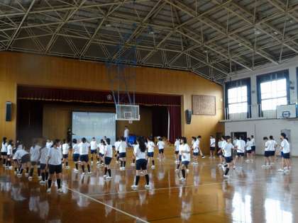 体育館では2,3年生が体育大会での集団演技に向けての授業を行っていました。後ろを振り返って気をとられることもなく,自分たちの「動き」を確認しながら懸命に練習をしていました。