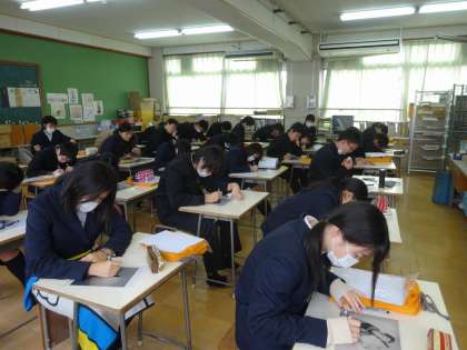 3年生の美術では点描を学習しています。点の濃淡で下絵通りのイメージを再現していく緻密な作業です。集中力が要りますが、受験勉強とはまた違う集中で気持ちのリフレッシュにもつながることでしょう。