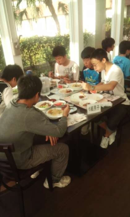 さぁ、おなかが減ったはずです。バイキングなのでしっかり食べて下さい。食後は、レクです。仲間の輪(和)、クラスの輪(和)、学年の輪(和)を確かなもにすべく、思いっきり盛り上がって、修学旅行最後の夜を楽しんで下さい。だって、目標は、“おきな輪”なのですから。でも、あんまりな夜更かしはダメですけど・・・。