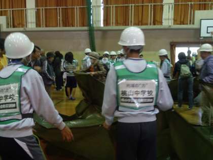 後半は,体育館で避難所の設置と人数点呼や食事配布,伝達などを実際にやってみました。