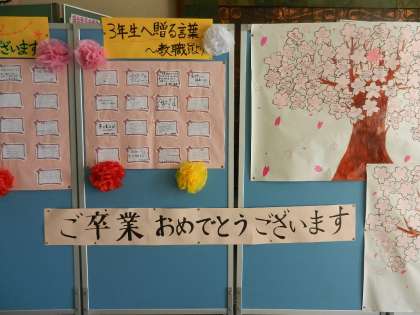 玄関にも,3年生の卒業を祝うメッセージが飾られています。
