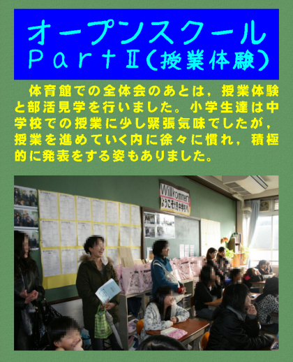 体育館での全体会のあとは,授業体験と部活見学を行いました。小学生達は中学校での授業に少し緊張気味でしたが,授業を進めていく内に徐々に慣れ,積極的に発表をする姿もありました。