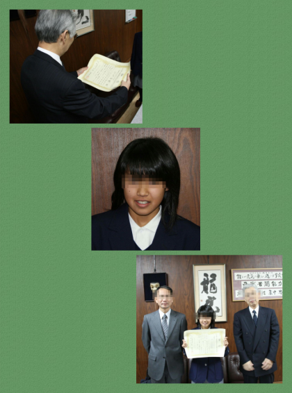 平成22年度全国中学生人権作文コンテスト京都大会において,本校1年生のN.Mioriさんが『京都人権擁護委員協議会長賞』に選ばれました。京都大会85校8,823編での受賞です。12月9日(木)京都人権擁護委員の方が来校され,校長室で賞状が授与されました。12月の人権月間にふさわしい一コマとなりました。