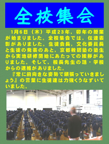 1月6日(木)平成23年,卯年の授業が始まりました。全校集会では,伝達表彰がありました。生徒会長,文化委員長と生徒の発表のあと,京都教師塾の塾生から実地研修開始にあたっての挨拶がありました。そして,校長先生の話・学校からの連絡がありました。『常に前向きな姿勢で頑張っていきましょう』の言葉に生徒達は力強くうなずいていました。
