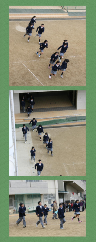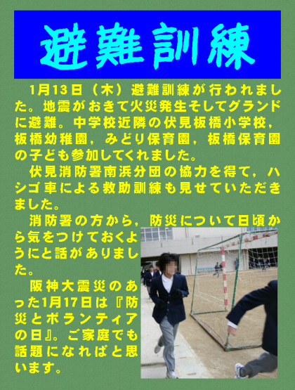 1月13日(木)避難訓練が行われました。地震がおきて火災発生そしてグランドに避難。中学校近隣の伏見板橋小学校,板橋幼稚園,みどり保育園,板橋保育園の子ども参加してくれました。伏見消防署南浜分団の協力を得て,ハシゴ車による救助訓練も見せていただきました。消防署の方から,防災について日頃から気をつけておくようにと話がありました。阪神大震災のあった1月17日は『防災とボランティアの日』。ご家庭でも話題になればと思います。